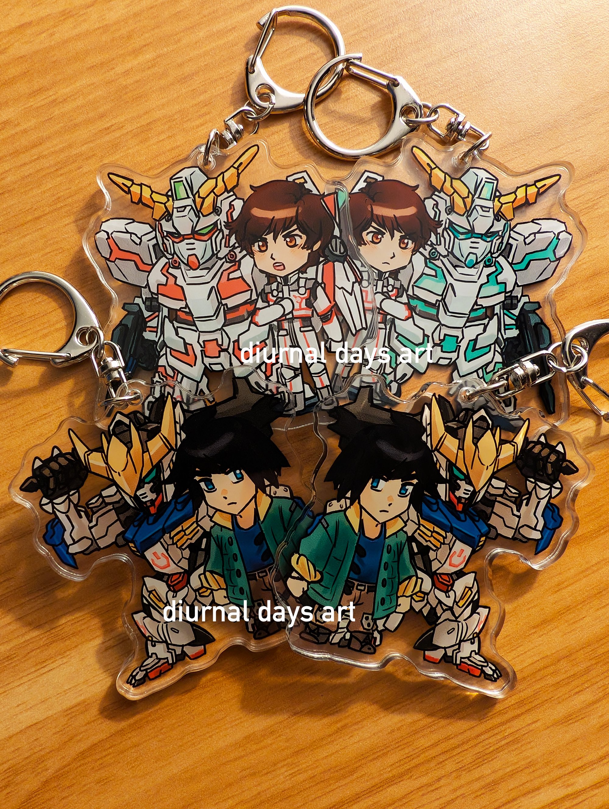 2.5 inch double-sided clear acrylic keychains with metal clasps. The Unicorn design has a different color scheme on each side, while the Barbatos design has Mika's blind eye flipped to be on the correct side of his face on both sides.